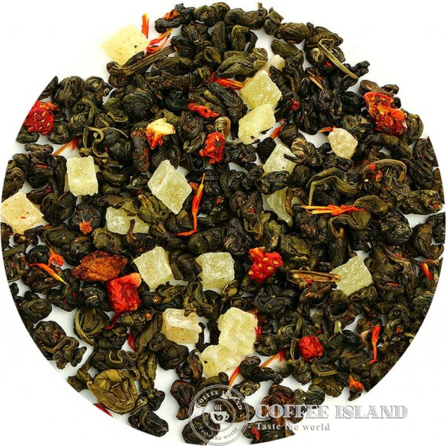Яркие красные огоньки на фоне темно-зеленого чая выгодно дополнены глубоким тоном зелени листьев.