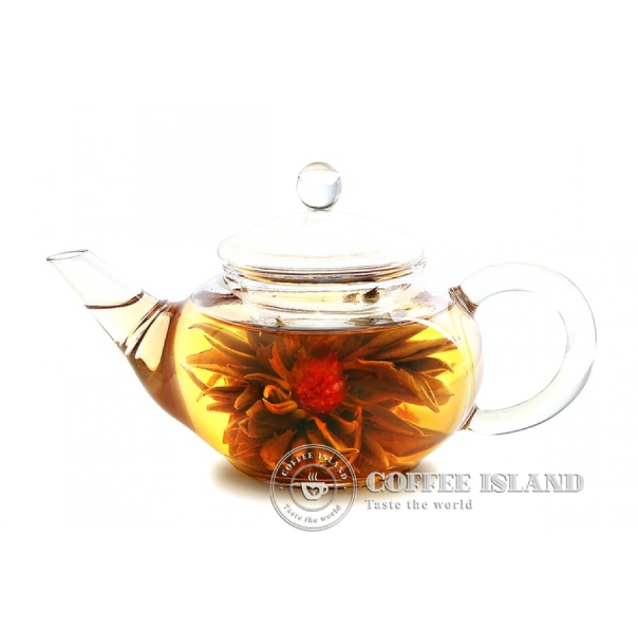 При контакте с водой связанный из длинных и тонких чайных листочков бутон медленно раскрывается, и из него выплывает прекрасный цветок. Необыкновенная красота происходящего подарит вам незабываемое наслаждение. Наслаждаясь чаем, можно долго наблюдать за тем, как колышутся лепестки.