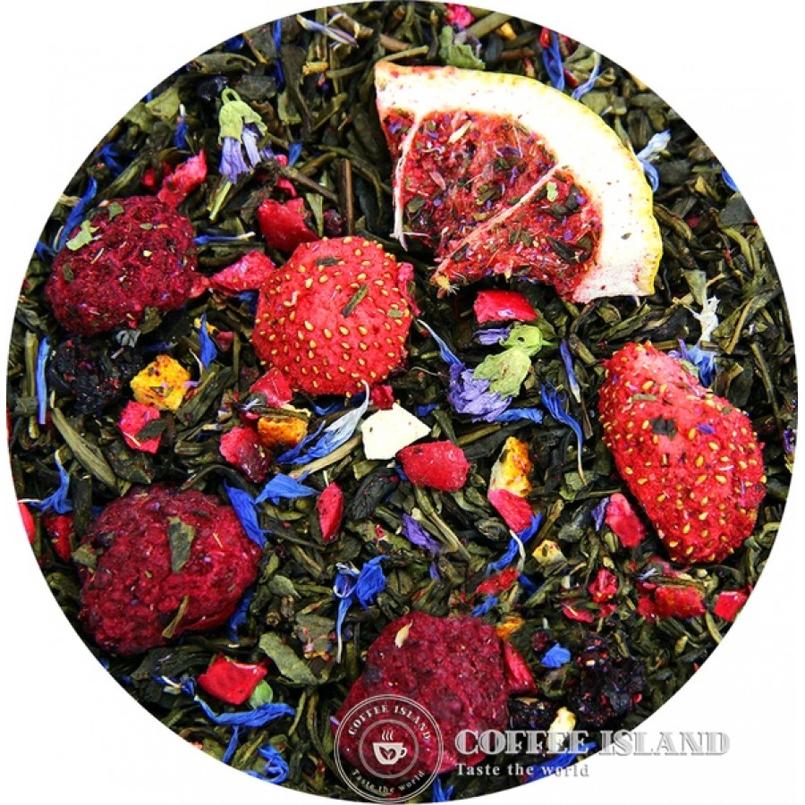 Чай зеленый китайский среднелистовой, целые ягоды малины, целые ягоды клубники, кусочки апельсина с цедрой, дольки лимона, кусочки клюквы, кусочки ежевики, лепестки василька синего, цветы мальвы, аромат фруктового сада
