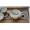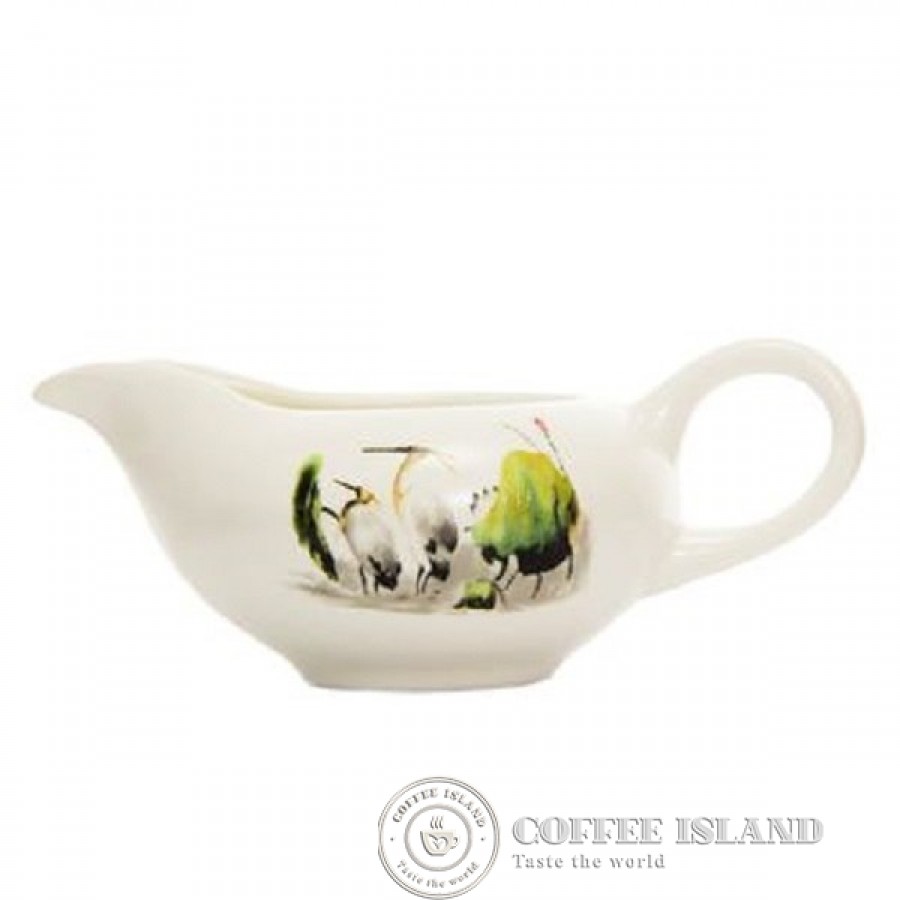 Чахай из белого фарфора, приплюснутой округлой формы, с петлеобразной ручкой. Горловина переходит в плавно изогнутый носик.