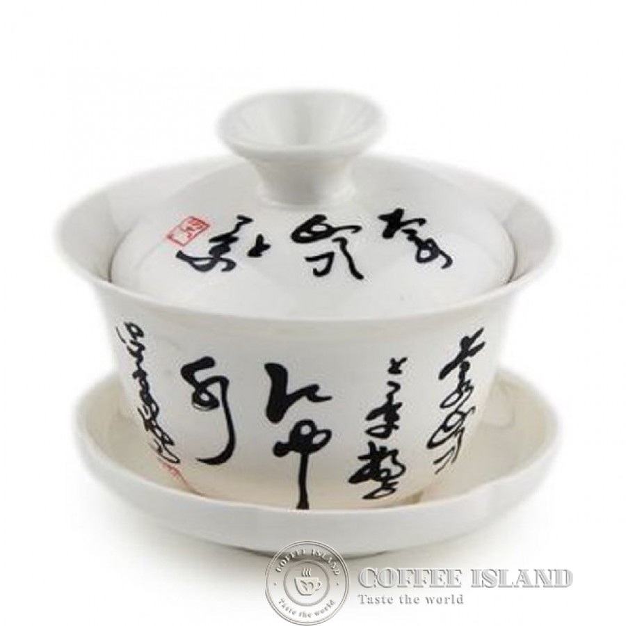 Фарфоровая гайвань 90 мл, с изображением китайских иероглифов.