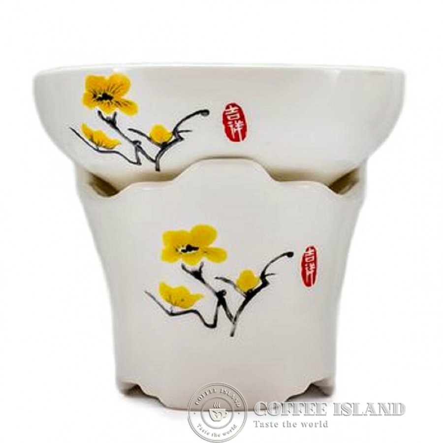 С подставкой конической формы с фигурными краями. Из белой керамики, с изображением желтых цветов.