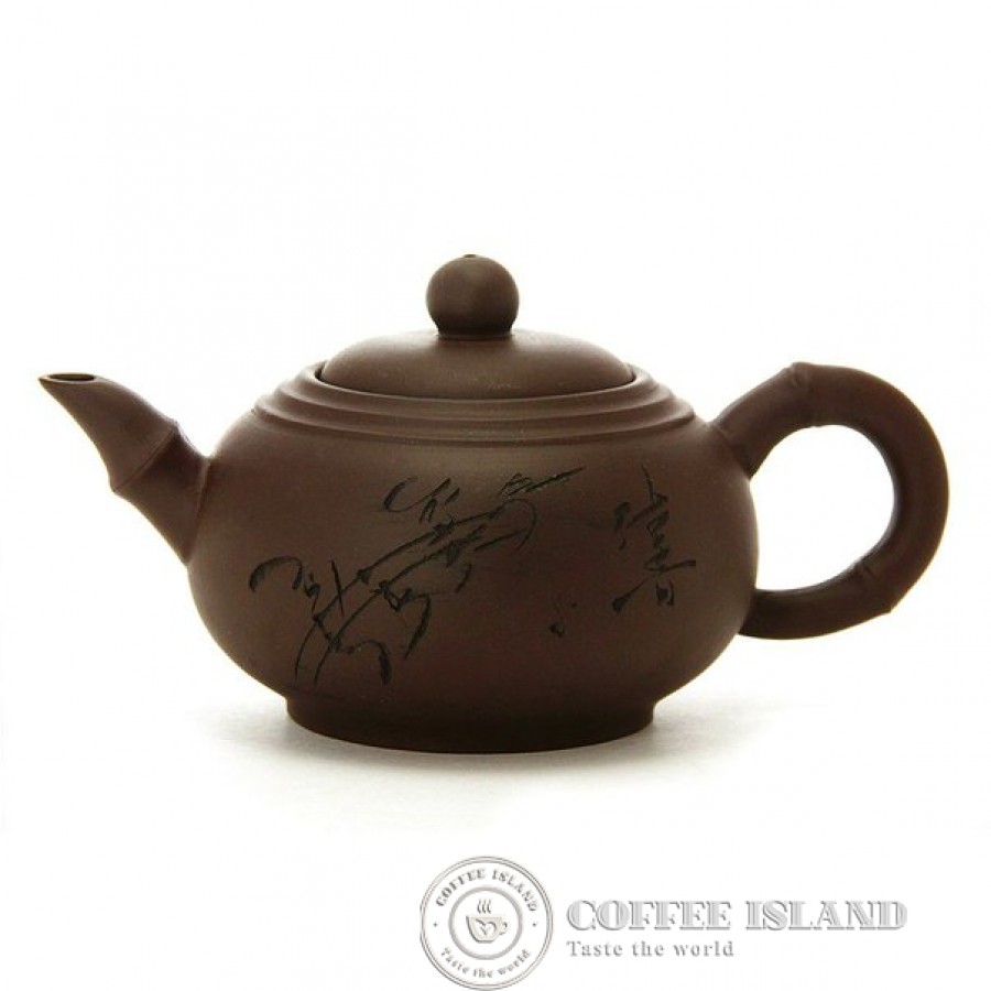 Глиняный чайник, корпус которого составляет с крышкой силуэт приплюснутой шарообразной формы, носик и ручка стилизованы под ствол бамбука.