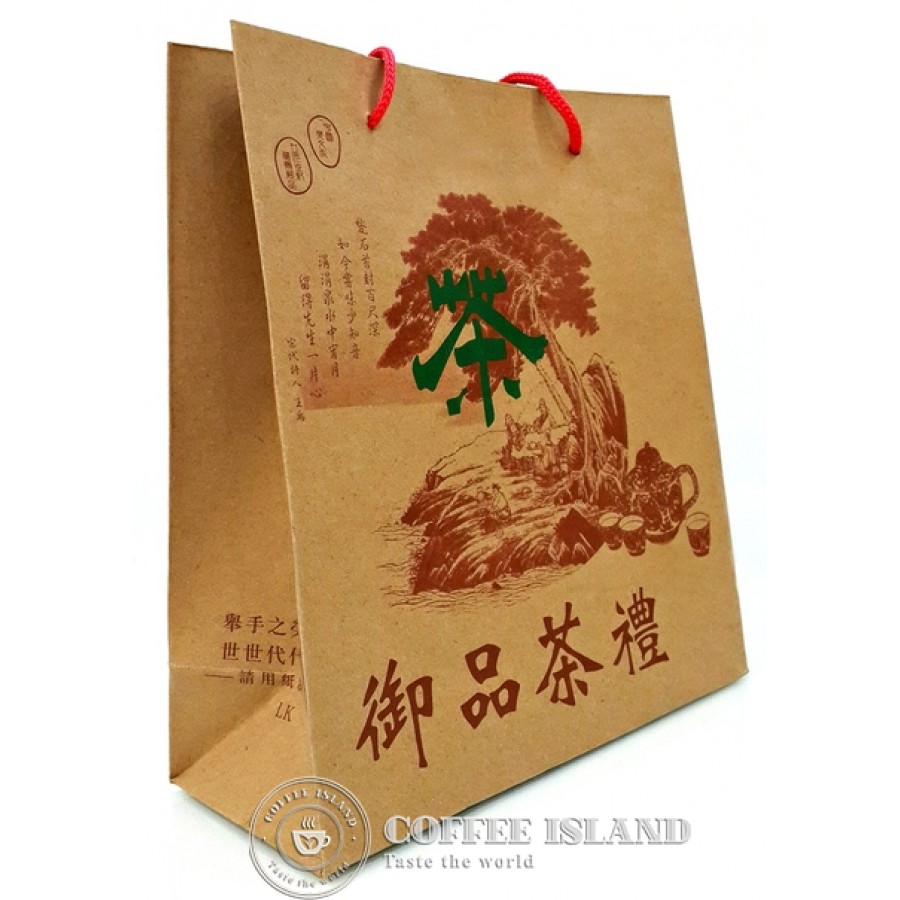 Подарочный дизайнерский пакет из плотной крафт-бумаги с плетёными ручками из красного шнура, живописным изображением чайного дерева и каллиграфией.