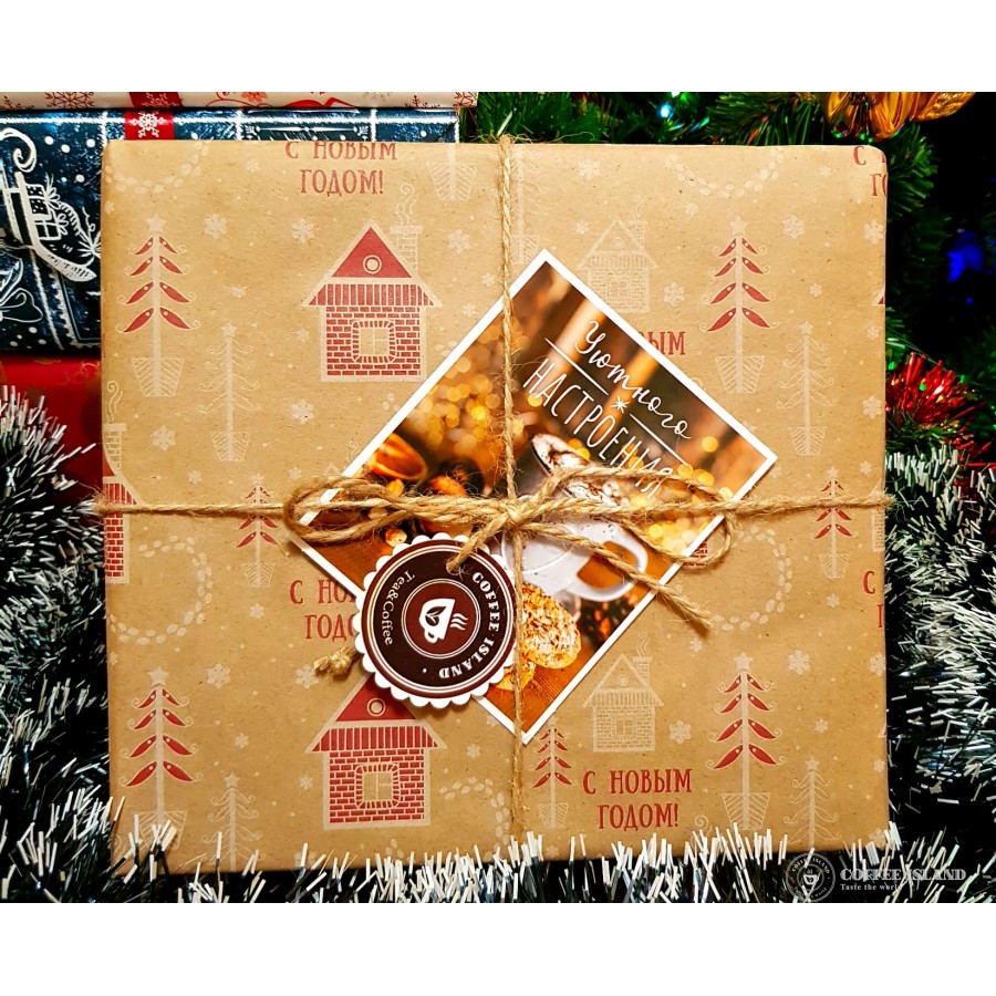 Подарочная коробка в фирменном стиле, обёрнутая в красивую бумагу с джутовым шпагатом, крафтовой открыткой и биркой Сoffeeisland.