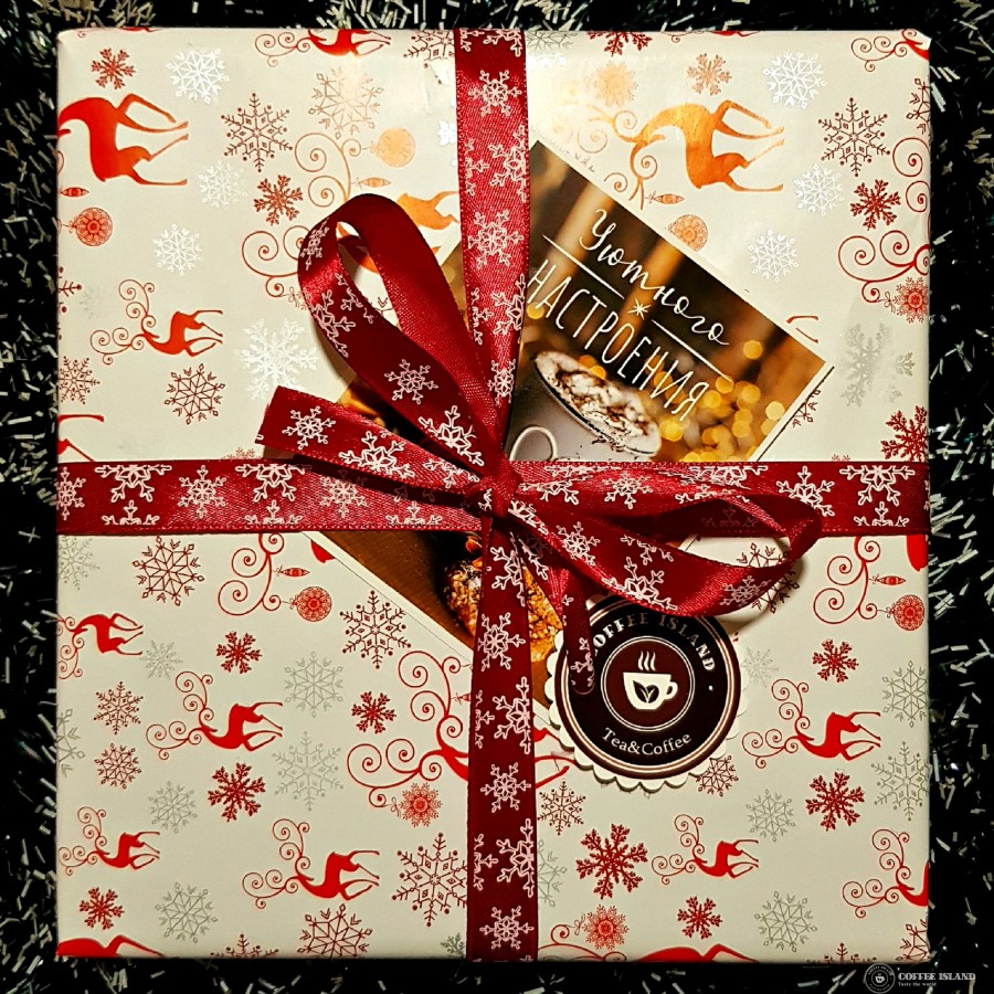 Подарочная коробка в фирменном стиле, обёрнутая в красивую бумагу с джутовым шпагатом, крафтовой открыткой и биркой Сoffeeisland.