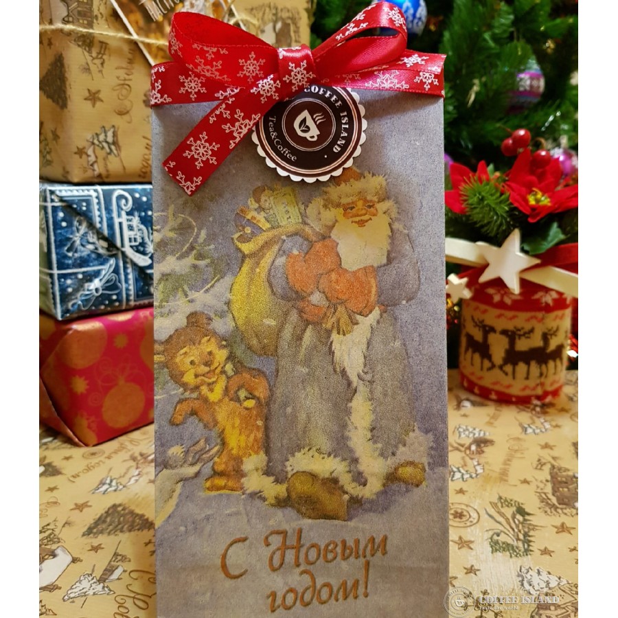 Подарочный дизайнерский пакет в ретро-стиле изготовлен из плотной крафтовой бумаги с изображением новогоднего мотива со всех сторон пакета, украшен красивым бантом из шелковой ленты и фирменной биркой Сoffeeisland.